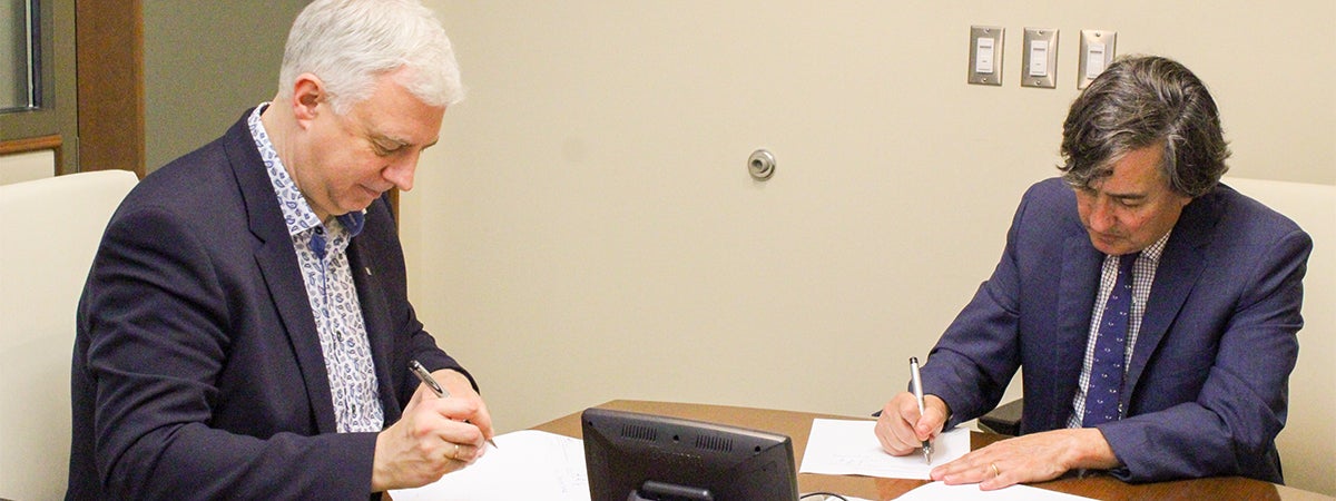 FSU Provost Jim Clark and Dr. Serhiy Kvit, President of the National University of Kyiv-Mohyla Academy in Ukraine, have signed a memorandum of understanding signifying the university's commitment to work together on future research projects.