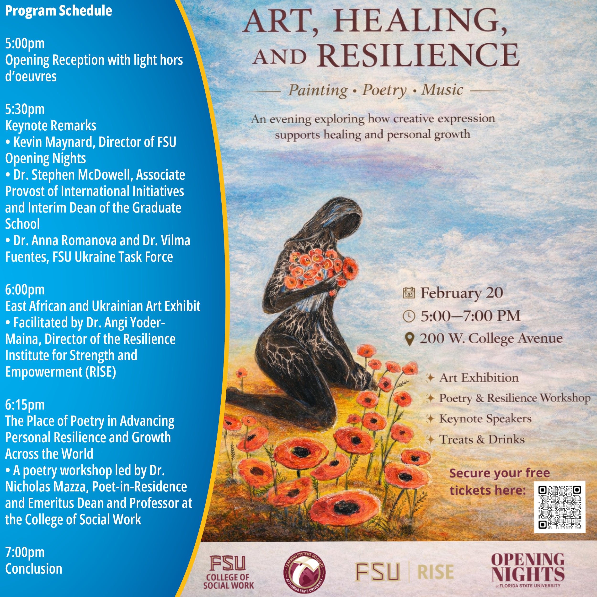 Join us Friday, February 20th from 5:00-7:00 p.m. for a free event exploring how different forms of art have helped people around the world heal and become more resilient. Please register at the link below as we highlight Florida State University’s ongoing work to advance research, promote student learning, support the creative arts and serve our community.
